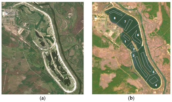 The transformation of the entire reservoir into several small bodies of water is illustrated by comparing Google Maps satellite images of the CP taken in 2014 (Figure 1a) and in 2020 (Figure 2a). For the model set-up, the CP was separated into eight sectors (Figure 2b) to describe small bodies of water that remained after the water level drawdown. The contamination of bottom sediments was analyzed by [2], taking into account multiple measurements over the whole CP in the 1999–2013 period. In this study, we integrated deposited inventories of 137Cs in 2013 taken from the map [2] over eight sectors shown in Figure 2b and compared the total activities of 137Cs in bottom sediments between measurement data and model simulation.