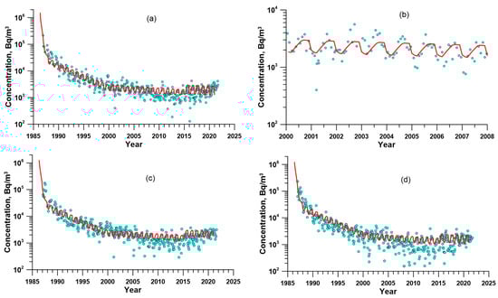 Calculated (line) and measured (dots) concentrations of 137Cs in the water of the CP: (a) Sector 1 with (b) zoom-in from 2000 to 2008 to show seasonal variations; (c) Sector 4; and (d) Sector 8.