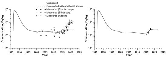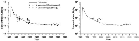 Since there are much fewer data of measurements for 90Sr in fish compared with the 137Cs data, we compare only the calculated concentration in non-predatory (prey) fish with measurement data in silver carp, crucian carp, and roach (Figure 8). The agreement between the calculated and measured concentrations in fish confirms the supposed value of the additional source of radionuclide in Sector 1 (Figure 8-left) and the absence or much lower value of the source in Sector 7 (Figure 8-right). The agreement between simulated and observed concentrations of 90Sr in water in all sectors, where data of measurements are available, is confirmed by values of GM = 0.81 and GSD = 1.53 for N = 414 records. The corresponding comparison is plotted in the Supplementary Materials (Figure S6). For non-predatory fish, GM = 1.1 and GSD = 1.55 for N = 48.