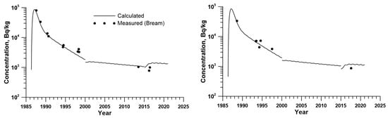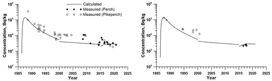 Similar changes in calculated concentrations are shown for coastal predators feeding on both pelagic and benthic organisms, which was compared with perch and pikeperch (Figure 5), and for demersal fish, which was compared with bream (Figure 6). The difference corresponds to more smooth changes in 137Cs concentrations for fish species from higher trophic levels. In addition, the highest concentration of 137Cs radionuclide in organisms with a benthic diet in first years after the accident is lower compared to pelagic organisms due to the time delay between peaks of the water and sediment concentrations. After the equilibration, the concentration of 137Cs in organisms with a benthic diet become higher due to an additional pathway of activity from bottom sediments to fish through the food web [18,24,25]. Figure 4 and Figure 5 show that predatory fish have higher calculated and observed concentrations compared with non-predatory fish, indicating the importance of trophic levels. This finding is consistent with [26], which investigated the effect of mass and trophic level on the concentration of radionuclides in fish, and with [6], where the 137Cs concentrations in non-predatory and predatory fish in the CP were simulated for the first five years following the accident. A similar conclusion was made by [27] based on a series of measurements indicating that aquatic organisms of greater mass, as well as higher trophic levels, have a higher concentration of 137Cs radionuclide. In summary, model results of 137Cs concentrations agree well with measurements for non-predatory fish (GM = 0.8, GSD = 1.68, N = 60) and demersal fish (GM = 0.94, GSD = 1.26, N = 18) and underestimate measurements for coastal predators (GM = 0.68, GSD = 1.87, N = 62).