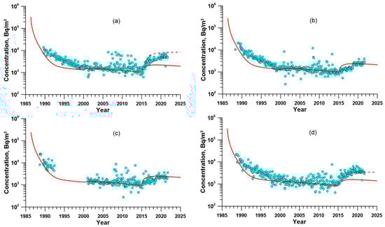 Calculated (line) and measured (dots) concentrations of 90Sr in the water of the CP: (a) Sector 1; (b) Sector 4; (c) Sector 5; (d) Sector 8. Dashed line corresponds to the scenario with an additional source of 90Sr equal to 3 GBq/y after the water level drawdown.