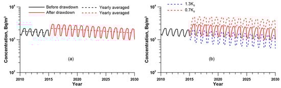As described in Section 3.1, some increase in 137Cs concentration and its seasonal variations in separate water bodies on the site of the CP are expected after the water level drawdown (Figure 3). To estimate such an increase, the POSEIDON-R model was applied with model parameters before drawdown, and the near-future forecast of 137Cs concentrations is demonstrated in the water of Sector 1 without and with Kd changes (Figure 9). According to model results of 137Cs concentration in Sector 1 (Figure 9a), the increase in yearly averaged concentration and seasonal variations is estimated as 36% and 1.34 times, respectively. Similar values are obtained for other sectors of the CP (not shown). These results correspond to the situation when the distribution coefficient Kd has not changed due to the water level drawdown. However, after the CP drawdown, the concentration of [K] and [NH4] ions could change as a result of forming new biochemical conditions in each separated body of water that leads to the spatial and temporal variability of Kd values. Demonstrating uncertainties of Kd in simulations, the 30% change of Kd values in both directions shows the higher and lower declining trends of 137Cs concentrations of in the CP (Figure 9b). In addition, the amplitude of seasonal variations of Kd could also be changed after the water level drawdown. All these factors need further research investigations, collecting field data with spatial and temporal measurements to be used in future modelling studies.