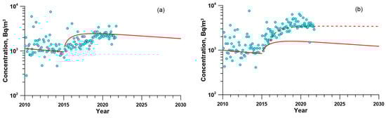 Changes in 90Sr concentration in the water in Sector 5 (a) and Sector 8 (b). Dashed line corresponds to the scenario with an additional source of 90Sr equal to 3 GBq/y after water level drawdown.