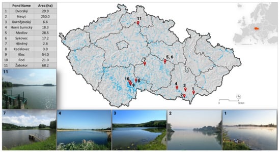 Nesyt, as the largest Moravian pond (250 ha), is located app. 25 km to the southwest at an elevation of 175 m (48.776° N, 16.731° E). An intensive, one-growing-season fish farming system is present in this pond. The predominant farmed species is common carp. Complementary species are pikeperch (Sander lucioperca L.), tench, northern pike (Esox lucius L.), wels catfish (Silurus glanis L.) and grass carp (Ctenopharyngodon idella Val.). The shoreline flora is formed by common reed (Phragmites australis (Cav.) Steud.) and bulrush (Typha latifolia L.). Dvorský pond (30 ha) is located in the southeastern part of Moravia at an elevation of 170 m (48.854° N, 17.072° E). Šumický horní pond (18 ha) is nature-protected area and is located in the southern part of Moravia at an elevation of 195 m (48.980° N, 16.469° E), and Kurdějovský pond (7 ha) is located at 195 m (48.935° N, 16.777° E) being about 23 km eastern direction from Šumický horní.