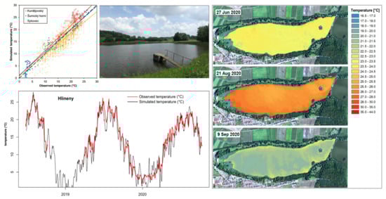 The RMSE ranged from 1.75 to 2.78 °C, and the correlation coefficient from 0.79 to 0.96 (Table 4). Graphical presentations of the comparisons between the measured and modeled surface water temperatures are shown in Figure 2 as a time series from Hliněný pond. The scatter plot on the top left depicts the results of an independent validation of the model, based on three ponds, Kurdějovský, Šumický horní and Sykovec (Table 4). The right panel of Figure 2 also demonstrates the high uniformity of the surface temperature across the pond area with the overall spatial difference between the warmest and coldest spot being less than 1.5 °C.