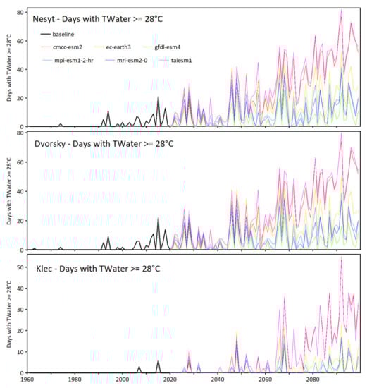 The results of the model using the climate change meteorological dataset estimated increasing surface water temperatures in all fish production areas as shown in Figure 3 for three representative ponds: Nesyt and Dvorsky, which are typical representatives of South Moravian lowland ponds (elevation 175 and 170 m a.s.l., respectively), and Klec pond located at a higher elevation (430 m a.s.l.), which is typical for a South Bohemian production area. Before the year 2000, there was a very rare occurrence of days with water temperatures above 28 °C (challenging for carp), ranging from zero to about 20 days per year at maximum, which was more pronounced in the case of the Nesyt and Dvorský lowland ponds due to their low elevation, and was almost nonexistent in the case of Klec pond in higher elevations. However, there is a steep increase in the overall number of days with water temperatures above 28 °C after 2020 for lowland ponds, from about 20 days in 2020 to almost double in 2040. After the year 2040, the increase is evident even for the Klec pond, and rises steadily towards the end of the 21st century. After the year 2050, there is more variation in the projected values given by the different GCMs used.