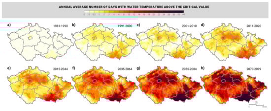 Spatial analysis of days with water temperatures above 29.1 °C between 1981 and 2100 is depicted in Figure 4. The period 1981–2020 is based on observed weather data, while the period 2020–2099 represents the median value from the ensemble of six GCM models and four emission scenarios. It can clearly be seen that there is a progressive increase in the occurrence of water temperatures exceeding 29.1 °C from 1981–1990 (Figure 4a) towards the end of the 21st century (Figure 4h). Although before the year 1980 (during the period 1961–1980) no such days occurred, for the period 2035–2064, more than 20 such days are projected for the South Moravia region (Dvorský, Nesyt, Kurdějovský and Šumický horní ponds). This progressive water temperature trend is most significant in the South Moravia region; however, it is also detected in the later periods after the mid-21st century in other regions. For the common carp in South Moravia, the median of the scenarios modeled is characterized by up to 25 days with surface water temperatures above the threshold temperature of 29.1 °C. In South Bohemia, the predicted number of days above this threshold is approximately half that of South Moravia. In the latter period, 2055–2084, Northern Bohemia also becomes affected, while Southern Moravia is expected to suffer more than 40 such days annually. The only exception to this pattern seems to be the South Bohemia region (Klec and Rod ponds) and Bohemian-Moravian highlands (Medlov, Sykovec and Hliněný ponds), where the threat during the 2035–2064 period is less serious due to the higher elevations at which these ponds are located.