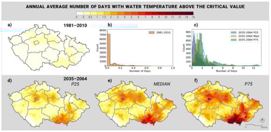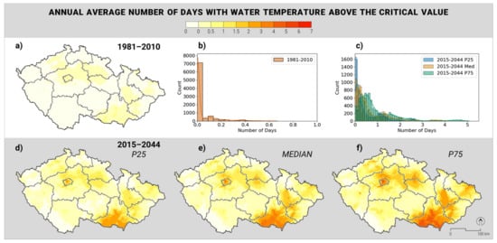 Figure 5 documents this sharp increase in the number of days that will inevitably affect the fish production. While Figure 5e represents the median of the six GCMs × four differently shared socio-economic pathways, Figure 5d represents the lower quartile and Figure 5f the upper quartile of this 24-member ensemble. The robustness of the shift towards higher temperatures is clear. Figure 5c shows that a considerable number of ponds will be affected by multiple days of high temperatures in an average season, signaling protracted periods of unusually warm water, especially in the southeastern and north-central parts of the Czech Republic. This trend is even more pronounced by 2050 as Figure 6 shows.