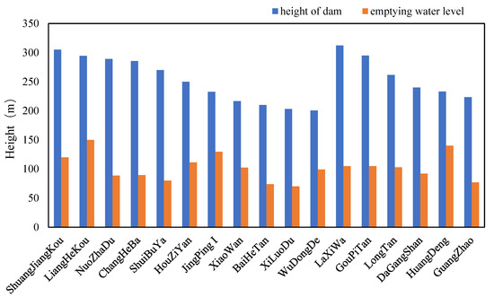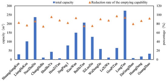 Using formulas (1) and (2), the following observations can be made regarding the emptying capacity of representative high dam and large reservoir projects in China: at present, the largest reduction rate of emptying head is Shuibuya Hydropower Station with 62.44%, while the reduction rate of most projects is only 30~50%, and the largest reduction rate of emptying capacity is Goupitan Hydropower Station with 96.75%, while most are in the range of 70~90% (Figure 2). Even for the high dam after the emptying storage decreasing rate is as high as 90%, an empty head lower rate can reach 50%. Only the remaining reservoir water sinks to the depth of an a-level one-hundred-meter high dam, which still has more than 100 million cubic meters that need to be filled with water (Figure 3). The same large storage capacity is equal to the (1) type of hydropower project. This emptying capacity is still drastically insufficient, to the extent that conditions do not even allow for adequate maintenance, and emergency safety provisions are seriously compromised.