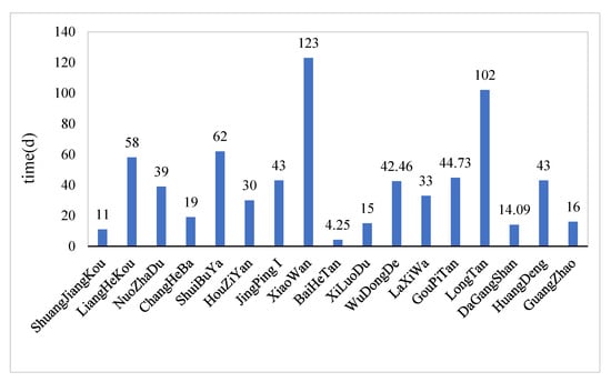 In addition to the above indicators, the emergency drawdown capacity can also be evaluated according to the drawdown time, drawdown capacity, and orifice area. According to the statistics of the drawdown time of the high dam and large reservoir project (Figure 4), it can be seen that the drawdown time is generally 20 to 40 days, some of which are 4.25 days short, and some of which are 102 days long. The average drawdown time per 100 million m3 of storage capacity is 1.86 days, the average drawdown time per 1 m of water level drop is 3.78 days, and the drawdown can only be carried out in the dry season when the upstream inflow is small. In the flood season, because the upstream inflow is large, the drawdown flow is small, and the drawdown cannot be carried out. Because the time of the emergency cannot be predicted, the emergency response can only be carried out according to the principle of “the reservoir water shall be as low as possible, the drawdown shall be as fast as possible, and the loss shall be as small as possible”. The existing 20-day or even 40-day emergency response time is relatively long. Therefore, the current drawdown time cannot meet the emergency venting requirements.