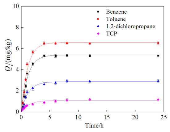 Adsorption kinetic curves of benzene, toluene, 1,2−dichloropropane, and TCP on natural sand. (The initial concentration of them was 5.30, 5.45, 6.93, and 6.32 mg/L, respectively. A total of 5 g of sand was added to 25 mL of pollutant solution).