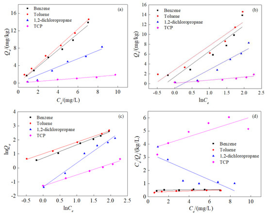 Isotherm fitting curves for each pollutant (The initial concentration of individual benzene, toluene, 1,2−dichloropropane and TCP was 1, 2, 4, 6, 8, and 10 mg/L, respectively. A total of 5 g of sand was added to 25 mL of pollutant solution). (a) Henry model; (b) Temkin model; (c) Freundlich model; (d) Langmuir model.