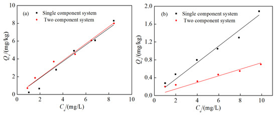 Competitive adsorption of benzene and toluene on the aquifer medium. (The initial concentration of the target compound was 1, 2, 4, 6, 8, and 10 mg/L, and the concentration of the coexisting solute was 2 mg/L). (a) Effect of benzene on the adsorption of toluene on the aquifer medium; (b) Effect of toluene on the adsorption of benzene on the aquifer medium.