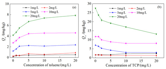 The competitive adsorption effect of toluene on TCP is shown in Figure 5a. The adsorption of TCP increased with increasing toluene concentration, indicating that toluene promoted the adsorption of TCP on the aquifer medium. Compared with the single component, the adsorption of 10 mg/L TCP increased by 10.3%, 35.1%, 72.7%, 79.0%, and 83.0% when toluene was added. Analogously, a study on the competitive adsorption of benzene, trichloromethane, and dichloromethane demonstrated that the adsorption of chlorinated hydrocarbons on the aquifer medium was promoted by the increasing concentration of benzene [20]. The increase in organic matter content in the medium resulted from aromatic hydrocarbon adsorption, and the partition of organic pollutants in the medium increased, thereby promoting the adsorption of chlorinated hydrocarbons. Aromatic hydrocarbons mainly affected the partition process of chlorinated hydrocarbon adsorption on aquifer media, while the competition of adsorption sites on the surface was relatively weak.