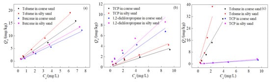 To clarify the influence of medium particle size on the competitive adsorption of aromatic hydrocarbon and chlorinated hydrocarbon pollutants on aquifer medium, coarse and silty sand were used as the aquifer medium to carry out competitive adsorption tests, as shown in Figure 6. The adsorption capacity of all pollutants on silty sand was significantly improved compared with that on coarse sand. Specifically, in the benzene and toluene solution system, the adsorption capacities of the benzene and toluene increased by 10.2%, 23.6%, 33.9%, 41.1%, and 41.2%, as well as 7.2%, 10.1%, 21.9%, 32.2%, and 30.3% for different concentrations, respectively. In a TCP and 1, 2−dichloropropane solution system, the adsorption capacities of TCP and 1,2−dichloropropane increased by 2.7%, 5.2%, 15.6%, 20.9%, and 27.1%, as well as 3.6%, 9.3%, 19.5%, 28.6%, and 26.7%, respectively. In the toluene and TCP solution system, the adsorption capacities of the toluene and the TCP increased by 1.4%, 7.3%, 17.9%, 25.5%, and 26.8%, as well as 0.6%, 4.5%, 18.4%, 18.3%, and 24.5%, respectively. Therefore, the smaller the particle size of the medium was the more conducive it was to the adsorption of organic pollutants, which was due to a larger specific surface area and more adsorption sites provided by a smaller medium particle size [30,31]. Furthermore, the effect of a smaller size on the adsorption of pollutants was related to the competitive adsorbability of pollutants. The promotion effect for the pollutants decreased, in turn, from toluene, benzene, 1,2−dichloropropane, and TCP, meaning that the adsorption of aromatic hydrocarbons and chlorinated hydrocarbons was mainly affected by medium size through the surface adsorption sites rather than the partition effect.