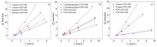 The effect of NOM on the competitive adsorption of (a) benzene and toluene, (b) TCP and 1,2−dichloropropane, and (c) toluene and TCP in different two−component systems. (The content of soil organic matter before and after treatment was 0.25% and 0.08%, respectively).