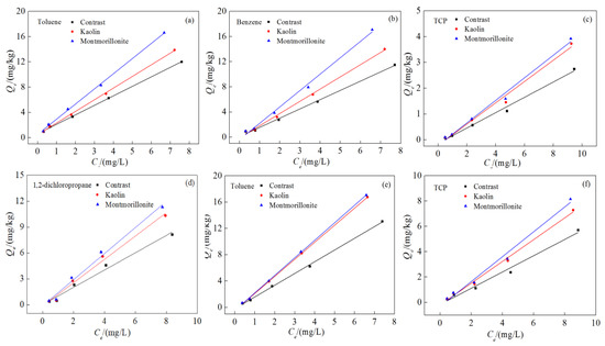 The effect of clay minerals on the competitive adsorption of (a,b) toluene and benzene, (c,d) TCP and 1,2−dichloropropane, and (e,f) toluene and TCP in different two−component systems. (The amount of clay minerals added was 10%).