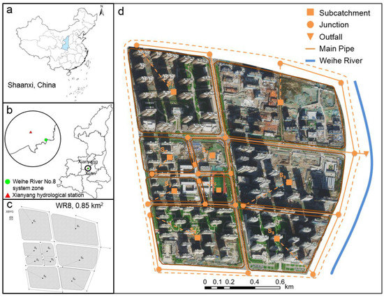 Map of the study area for simulation: (a) Shannxi Province, China; (b) Weihe River No. 8 system zone (WR8), Fengxi New City; (c) Study area map of WR8 in storm water management model; and (d) Aerial photographs of WR8.