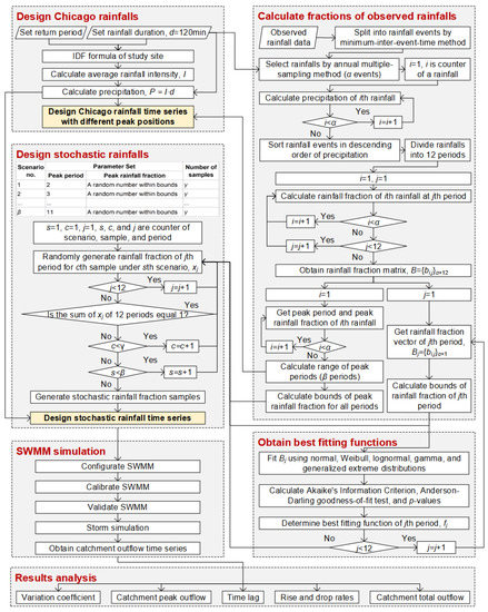 Meanwhile, we used the Chicago method [20] to design ten events of 2-year, 120 min storms with peak periods ranging from 2 to 11 for comparing the catchment outflows.