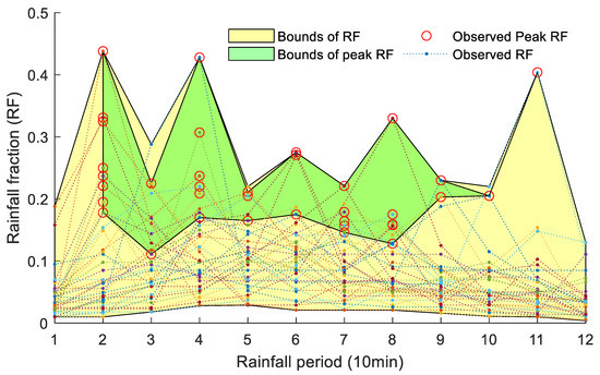 (3) The peak RF should be within the lower and upper limits of the measured peak RF. The peaks of the measured precipitation events are in the 2–11 periods (see Figure 3), so we let the rainfall peak at the pth period (j = 2, 3, …, 11):