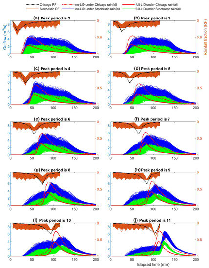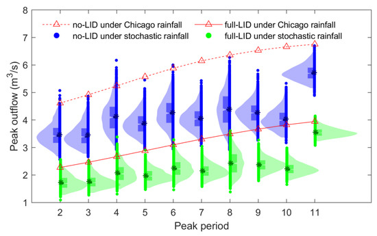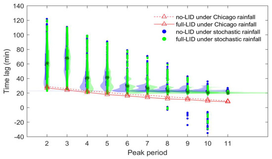 The rainfall peak period and its cumulative depth significantly influence the time lag, which refers to the lag of the peak moment between outflow and rainfall. Figure 7 shows a gradual decrease in the time lags as the rainfall peak period increases. The result might be explained by the fact that the soil moisture contents at the rainfall peak moment were higher under precipitation events with a larger peak period, so the run-off and outflow rose earlier. For a given peak period, the time lag under most stochastic precipitation events exceeded that under Chicago precipitation events, suggesting that the Chicago patterns were a high-risk pattern compared to most stochastic patterns. Exceptions included some stochastic precipitation events with peak periods of 2, 4, 5, and 8–10. We analyzed these stochastic precipitation events’ RFs and outflows and determined that their cumulative RFs at the rainfall peak period exceeded that of the Chicago precipitation events. The lag time under a few stochastic precipitation events with a peak period of 8–10 turned negative. ore specifically, their peak time of outflow occurred earlier than that of rainfall. Further analysis showed that their outflow CV values were small (most had bimodal peaks), and the cumulative RFs at the rainfall peak period were above 0.74, 0.89, and 0.90, respectively. In addition, the time lag in the full-LID scenario exhibited a more concentrated distribution with increasing rainfall peak periods under stochastic precipitation events. This can be attributed to the concentration of outflow peak time as the rainfall peak period increased.