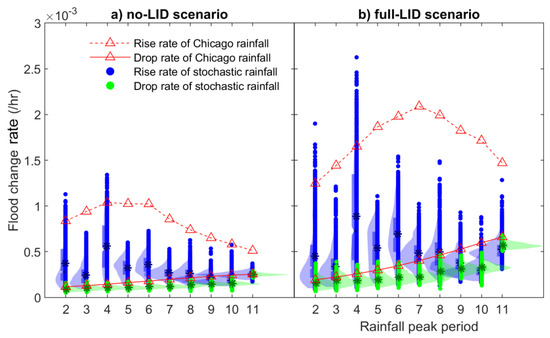 Rise and drop rates of flood time series in (a) no- and (b) full-LID scenarios under Chicago and stochastic precipitation events. * represents the median.
