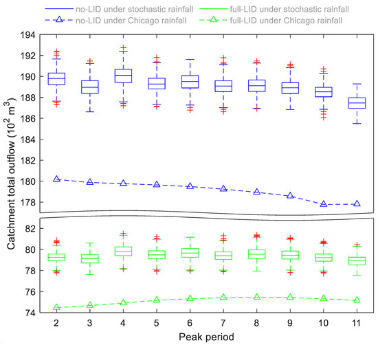 Catchment total outflow in no- and full-LID scenarios under Chicago and stochastic precipitation events. + represents the outlier.