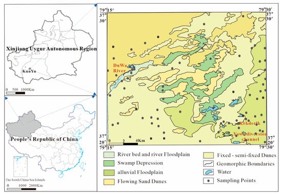 Kunyu City is located in the southwest of Xinjiang Uygur Autonomous Region, at the northern foot of the Kunlun Mountains and the southern margin of the Tarim Basin. Based on the latest Gaofen-2 remote sensing image, the topography of the area was interpreted using remote sensing interpretation markers for each landform. Subsequently, GIS was used to calculate the proportion of each landform, and the interpretation results were verified through field investigations. The interpreted data was authentic and reliable. The mountainous area accounts for 33.3%, the Gobi desert accounts for 63%, and the oasis area only accounts for 3.7%, sporadically scattered among the Gobi desert. The study area is situated at the desert area of the lower Duwa River. The terrain is relatively open and flat, and the topography of small areas is relatively complex with many dunes. The topography is high in the west and low in the east, high in the south and low in the north, mainly developing mobile dunes, fixed-semi-fixed dunes and alluvial plain landforms. According to the information published by the local meteorological office, it belongs to a typical warm temperate inland arid climate. The main climatic characteristics are hot in summer, cold in winter, large diurnal temperature difference, scarce precipitation and strong evaporation. The average annual precipitation is 29 mm, and annual evaporation is 4410 mm. The Duwa River is the major surface water system flowing through the region, flowing from south to northeast, and gradually disappearing in the Gobi desert after passing through the Duwa Reservoir (Figure 1).