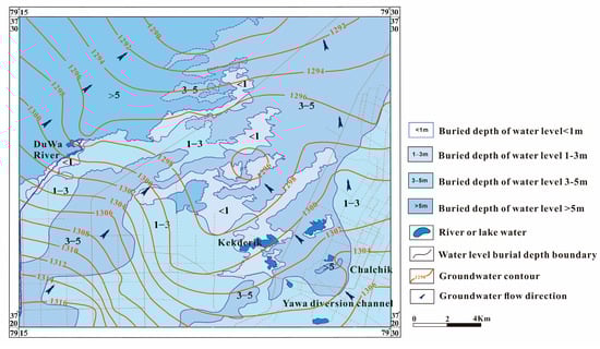 According to the lithology and hydrogeological characteristics of Quaternary sediments, combined with pumping tests and previous hydrological borehole data, the Quaternary Holocene (Qh)-Pleistocene (Qp) aquifer group in the study area belongs to pore water in loose rocks. The aquifer is primarily composed of fine sand and silt, with a thickness ranging from 50 to 76 m (the comprehensive histogram in the study area is shown in Figure S1 of the Supplementary Materials). The depth of the water table varies significantly across different geomorphic types. The flowing dune area in the northwest has a depth of over 5 m, while the fixed and semi-fixed dune area in the southwest and northeast ranges from 3 to 5 m. In the alluvial plain, the water table depth is 1–3 m, whereas, in the central swampy depressions and some parts of the northwest riverbed and floodplain, the depth is less than 1 m. Generally, the water table depth decreases from northwest to southeast, as shown in Figure 2. Combined with the hydrogeological borehole and previous geological data, the area shows a distribution pattern of weak water richness in the northwest and medium in the southeast.