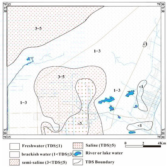 The distribution map of TDS in the research area is shown in Figure 3. The variation of TDS ranges from 714.0 to 19,100.0 mg/L, and the average value is 3028.7 mg/L. According to its classification standard [33], the groundwater in study area mainly belongs to brackish water and semi-saline, and its distribution area accounts for 63.06% and 20.06% of the total area, respectively. Freshwater is scattered in the southeastern of the study area, making up only 2.59% of the total area. In comparison, saline water is mainly distributed near the Kekderik, with a strip distribution area of about 82.15 km2, accounting for 20.06%. Mainly due to the slow groundwater runoff, shallow water level, and strong evaporation, the TDS value in this area is relatively high. COD is an indicator that characterizes organic pollution in water. The CODMn range in the study area is between 0.8 and 7.0, with an average of 2.3. Most water samples have low CODMn values, which comply with the Class III water regulations in the Sanitary Standard for Drinking Water (GB5749-2006) [34]. Only seven water samples exceed the Class III water limit.