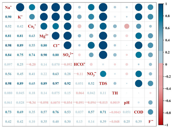 Correlation analysis can show the close degree between different hydrochemical parameters, which is helpful to better understand the hydrochemical process and ion source. The Pearson correlation analysis results of various indicators are shown in Figure 4. It can be observed from the figure that Na+ has a strong correlation with K+, Mg2+, SO42−, Cl− and TDS, indicating that sodium ions may have many sources. Ca2+, Mg2+ strongly correlate with SO42−, but have a poor correlation with HCO3−. TDS has a strong positive correlation with Cl−, indicating that saline rock may be dissolved along the flow path [35]. However, the correlation between NO3− and other parameters is weak because its source is mainly artificial, such as the application of nitrogen fertilizer in jujube trees.