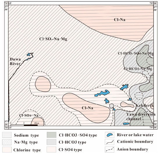 The Shukarev method is used to classify hydrochemical types based on the concentration and mineralization degree of six common major ions in groundwater. According to the Shukarev method classification [36], the hydrochemical types in the study area can be divided into seven categories (Figure 5). The Cl-SO4-Na-Mg type and Cl-Na type are predominant, among which the Cl-SO4-Na-Mg type groundwater is generally distributed in the flowing dunes and fixed-semi-fixed dunes. The groundwater runoff conditions in these areas are poor, and water alternation is medium. The concentration of Cl−, SO42−, Na+, and Mg2+ in groundwater is relatively high, while the content of other ions is relatively low. The Cl-Na type groundwater is found in the northeast desert and the vicinity of Kekderik. Its groundwater depth is shallow, runoff is slow, evaporation is strong, local groundwater is stagnant, salt accumulation is serious, and Na+ content is high. The groundwater in the southern swamp depression primarily belongs to the Cl-SO4-Na type. Due to the influence of Karakash River and Yawa diversion channel, the groundwater in the eastern Yawa Township is mainly of Cl-HCO3-Na-Mg type and Cl-HCO3-SO4-Na-Mg type. In addition, Cl-Na-Mg type groundwater is only sporadically distributed in the east near Chalchik.