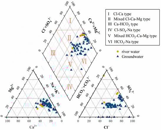 Figure 6 shows the piper trilinear diagram of groundwater hydrochemistry in the study area. In this diagram, water samples are relatively concentrated, basically falling into Zones Ⅳ and Ⅱ, and more than 90% are distributed in Zone Ⅳ. The main anions are close to the Cl− and SO42− ends, and their milligram equivalent percentages are mostly between 40% and 70%, with strong acids (Cl−, SO42−) exceeding weak acids (HCO3−). The main cations are close to the Na+ and Mg2+ ends, followed by Ca2+, and the concentration of alkali metal ions (Na+, K+) is higher than that of alkaline earth metal ions (Ca2+, Mg2+). The hydrochemical types mainly showed Cl-SO4-Na type and Cl-Na type. This result is similar to the water chemistry types classified by the Shukarev method.