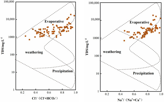The influence of rock weathering, atmospheric precipitation, evaporation and concentration on groundwater hydrochemistry can be qualitatively analyzed by the Gibbs diagram [37]. In the Gibbs diagram, when the TDS value is low and the ratio of γNa+/γ(Na+ + Ca2+) or γCl−/γ(Cl− + HCO3−) is greater than 0.5, the groundwater chemical components are mainly influenced by atmospheric precipitation [38]. While higher TDS values and also high γNa+/γ(Na+ + Ca2+) ratio or γCl−/γ(Cl− + HCO3−) ratio indicate that the groundwater chemical fraction is affected by evaporative concentration, otherwise by rock weathering. It can be seen from Figure 7 that the TDS values of water samples in the study area are high and 98% of them fall within the range of γNa+ /γ(Na+ + Ca2+) > 0.5, while the ratio of γCl−/γ(Cl− + HCO3−) is relatively dispersed, and parts of samples distributed in the region of rock weathering. This shows that the groundwater in this area is affected by both evaporation concentration and rock weathering, and the former is more significant.