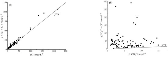 Groundwater formed under different genesis or conditions often has a large difference in the content ratio between components. Therefore, such ratio coefficients can be used to determine the source of groundwater components. Among them, the relationship of γ(Na+ + K+)/γCl− can be used to determine the sources of K+ and Na+ in groundwater. When the γ(Na+ + K+)/γCl− distribution is around the line y = x, the K+ and Na+ in groundwater are primarily from rock salt dissolution [39]. Figure 8a shows that K+ and Na+ in groundwater in the study area mainly originate from rock salt dissolution, 90% of the water samples fall in the zone where γ(Na+ + K+)/γCl− > 1, only a few water sample points fall below. This indicates that the content of Na+ and K+ is more than that of Cl−, which may be caused by the dissolution of silica-aluminate minerals containing sodium and potassium (e.g., feldspar), or there may be alternating cation adsorption.
