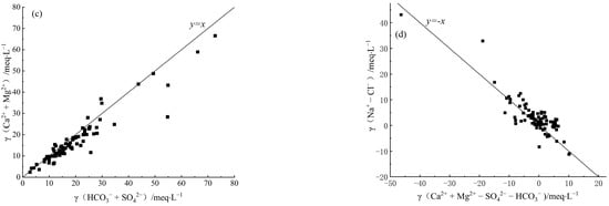 The dissolution of carbonate rocks in groundwater can be judged by the relationship of γ(SO42− + Cl−)/γ(HCO3−) [39]. As seen from Figure 8b, the groundwater samples all fall above the line y = x, indicating that the chemical composition of groundwater is mainly influenced by the dissolution of evaporite, and the influence of carbonate rocks is weak. The main sources of Mg2+ and Ca2+ can be determined by analyzing the ratio relationship between γ(Ca2+ + Mg2+) and γ(HCO3− + SO42−) [40]. Figure 8c indicates that over 80% of the groundwater samples are located below γ(Ca2+ + Mg2+)/γ(HCO3− + SO42−), indicating that Mg2+ and Ca2+ in groundwater of the study area are primarily from the weathering dissolution of silicate and evaporite, and only a tiny part is related to the weathering dissolution of carbonate rocks. Meanwhile, in Figure 4, both Ca2+ and Mg2+are strongly correlated with SO42−, which further explains that the dissolution of gypsum and magnesium sulfate is an important source of Ca2+ and Mg2+.