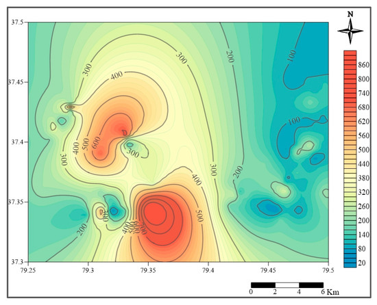 Based on the WQI values, groundwater quality can be classified as excellent water (<50), good water (50–100), poor water (100–200), very poor water (200–300) and unsuitable (>300) [43]. The WQI values in the study area range from 43.0 to 1442.9, with a mean value of 224.2, which is relatively large. Only 16 samples belong to the grade of excellent water to good water, and 11 samples belong to the unsuitable category. The rest of the water samples are poor or very poor water. The WQI spatial distribution map shows that most areas in the study area have high WQI values and are not suitable for drinking. Only the groundwater in parts of the eastern regions has low WQI values and is suitable for drinking.