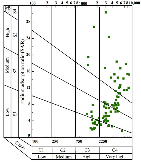 Salinity has a significant effect on soil alkalinity and crop growth, and when irrigated with high salinity groundwater, it can lead to soil hardening and inhibit crop growth [44]. The hazard of salinity and alkalinity can be better understood using the United States Salinity Laboratory diagrams (USSL diagrams), where salinity and alkalinity are expressed in terms of electrical conductivity (EC) and sodium adsorption ratio (SAR), respectively [13]. The USSL classification map of the study area was plotted (Figure 10), in which 27% of the groundwater samples distributed in the high salinity region and the remaining 73% fell in the very high salinity region. The SAR values varied between 1.64 and 30.33, with a mean value of 8.47, which were evenly dispersed in the four classification regions S1–S4, and about half of the water samples fell in the high-very high alkalinity region. In summary, the study found that the groundwater in the study area has high-very high salinity overall, but the alkalinity is highly variable and the SAR value is high in some areas, which requires certain measures before it can be used for irrigation.