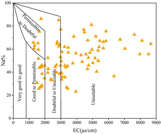 Wilcox plots reflecting salinity and sodium percentage (Na%) allow for the classification of irrigation water [45]. Plotting the samples data into the Wilcox plot (Figure 11), it is found that about 56% of the groundwater samples are in the unsuitable zone, 20% are in the doubtful-unsuitable category, 6% are in the permissible-doubtful category, and only 18% are in the good-permissible category. Most water samples fall within the doubtful or unsuitable range, indicating that the groundwater in this area is not suitable for direct irrigation, mainly due to the high salinity of the groundwater.
