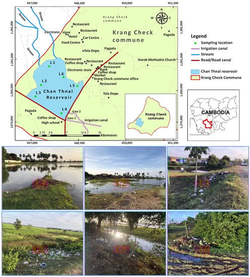 Cambodia has the typical two seasons of a tropical monsoon climate. The central region lies in a floodplain where the Tonle Sap and Mekong Rivers meet, while hilly mountains are located in the north and south. In Cambodia, agriculture dominates all other forms of economic activity. Rice is a staple food, and Cambodia’s primary income source comes from rice exports. Most of the arable land is used for rice farming. Vegetables are usually planted during the dry season after the rice is harvested. To attain marginal crop production, fertilizers and pesticides are generally used in paddy and crop farming. However, chemical fertilizers and pesticides remain essential to commercial cultivation and household production as they quickly increase yields and eradicate unwanted pests and weeds []. Direct exposure to the misuse of these chemicals has a detrimental effect on the health of farmers. Since pesticides and chemical fertilizers contain various heavy metals, drainage from agricultural areas where they are used may result in heavy metal contamination in natural water bodies. This circumstance leads to many hazards due to their toxicity, biodegradable persistence in the environment, and ability to bioaccumulate [,,]. Additionally, the persistent contamination of toxic metals in natural waters leads to accumulation in sediments, water, animals, and plants, reaching levels that are potentially detrimental to typical ecosystem functioning and re-entering humans through the chain [,,].