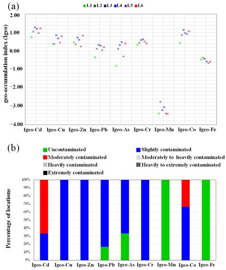 Results of the geoaccumulation index: (a) Igeo values of each heavy metal in all locations and (b) location-based percentage Igeo for each heavy metal.