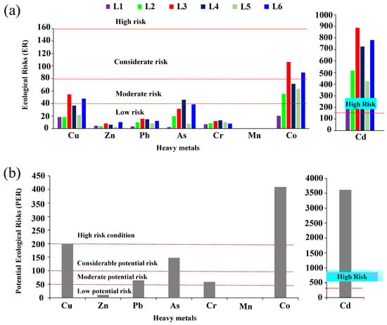 The PER value was calculated based on eight heavy metals (i.e., Cd, Cu, Zn, Pb, As, Cr, Mn, and Co) without Fe due to the absence of an iron biological toxicity factor. The results revealed a relatively high potential ecological risk of metal pollution in the Chan Thnal Reservoir. As presented in Figure 3b, the evaluation of potential ecological risk exhibited a low contamination risk for Zn and Mn, a moderate contamination risk for Pb and Cr, a considerable potential risk for Cu and As, and a high-risk condition for Co and Cd. However, discrepancies were found to some extent between the potential ecological risk index (PER) and the geoaccumulation index (Igeo). The Igeo value showed slight contamination and slight-to-moderate contamination for Cu and Co, respectively; however, the PER revealed considerable and high ecological risk potential, respectively. This inconsistency can be explained as follows: the geoaccumulation index estimates the concentration of each metal detected in sediments relative to the background concentration of lithogenic compositions, while ER emphasizes the relative toxicity of individual heavy metals, and PER expresses the cumulative ecological risk of all studied metals. The PER, regarded as the potential risk index, revealed the ecological risk contributions from heavy metal contamination as follows: Cd > Co > Cu > As > Pb > Cr > Zn > Mn. The average value of PER in the sediment was 500.532, which indicates that all sample locations in the sediment had a high potential ecological risk level. In agreement with the Igeo results, a location-based evaluation revealed the potential ecological risk of heavy metal contamination as follows: L6 > L3 > L4 > L2 > L5 > L1. In particular, the PER evaluation revealed a high level of ecological risk spread predominantly in L6, L3, and L4. Similar to previous reports, these locations are located near urban areas and have the highest concentration of human and agricultural activities [,,]. As shown in Figure 1 and Figure S1, L3 and L4 connect to the road canal and receive runoff and discharge from areas, such as schools, rice paddies, and farming households. L5 and L6 receive discharge from the municipal area (i.e., markets, petroleum stations, and local shops) and cattle and poultry farms.