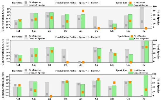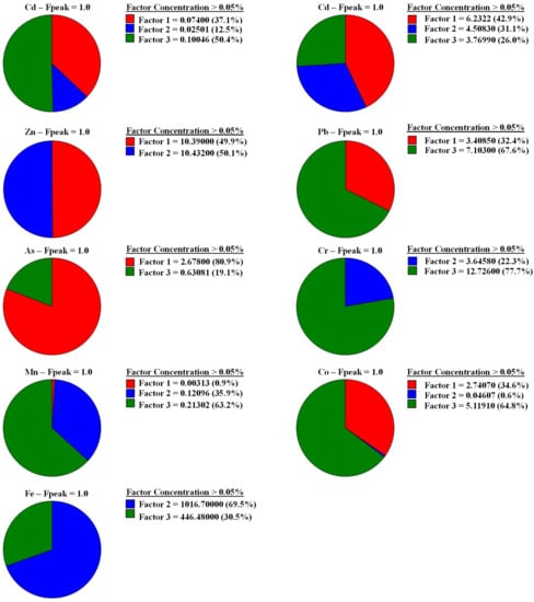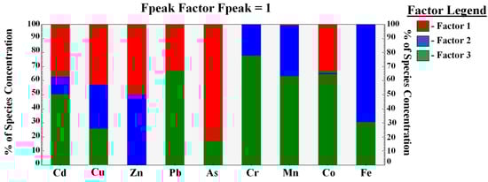 As shown in Figure 5, Cu, Co, Cd, and Mn contributed to all factors by more than 40–50% of their total amounts. For example, factors 1 and 2 contributed significantly to Zn contamination. Likewise, factors 1 and 3 contributed to a large extent of Pb and As contamination, and factors 2 and 3 contributed considerably to Cr and Fe contamination. Figure 6 depicts the PMF-derived factor fingerprints of metals, and Figure 7 illustrates the PMF-derived factor contribution of metals. Additional information regarding the source contributing factors can be found in Figures S1–S3.
