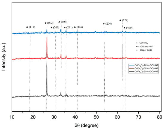 XRD patterns of CuFe2O4/rGO/HNT series at diffracted planes.
