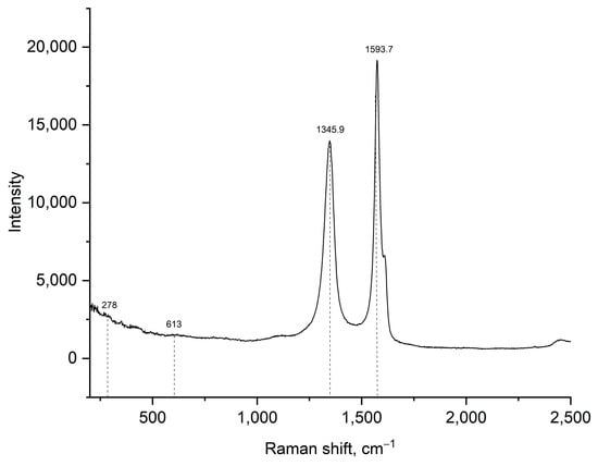 Figure 2 shows the results of material characterization by Raman spectroscopy. At wavelengths of 1345.9 cm−1 and 1593.7 cm−1, respectively, the measurement data demonstrate the typical peaks of HNT and rGO []. The signals measured at 278 and 613 cm−1 indicate the presence of CuFe2O4 [].