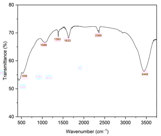 FT-IR spectroscopy was used to acquire more accurate information on the distinctive bonds in the materials. The material characterization results using FT-IR are shown in Figure 3. The distinctive vibrations with wave numbers at 1083 cm−1 (corresponds to Si-O), 912 cm−1 (corresponds to Al-OH), and 752 cm−1 (corresponds to Si-O-Si) demonstrate the presence of HNTs in rGO/HNT. No vibration of the carboxyl group (1714 cm−1) was observed, showing that elaboration of rGO/HNT involved the reduction of GO to rGO. The C=C and C=O groups of rGO have stretching vibrations that cause peaks at 1633 cm−1 and 1086 cm−1 [,]. A weak vibration at the wavenumber of 2360 cm−1 is characteristic of the C=O bond, indicating that a small portion of graphene oxide has not been completely reduced. In addition, vibrations at wavenumbers of 1383 cm−1 and 3445 cm−1 indicate the presence of OH groups in the halloysite nanotube composition, in rGO and adsorbed water in the synthesized catalyst. The existence of CuFe2O4 bonding with rGO/HNT is shown by the 530 cm−1 characteristic vibrations [,].