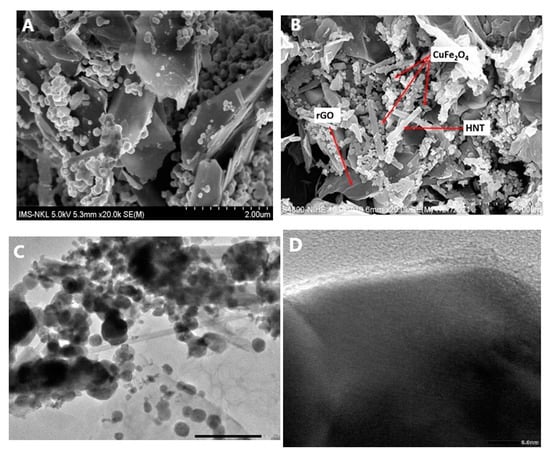 SEM (A,B) and HRTEM images (C,D) of CuFe2O4-70%/rGO/HNT.