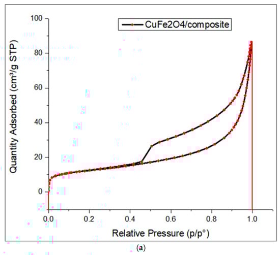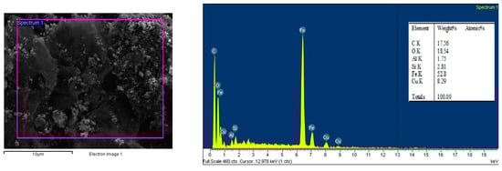 All the elements that make up the composite are present, according to the results. Active-phase of CuFe2O4 has a percentage composition of 64%, which is comparable to the initial calculation made while synthesizing (the sample contains 70% active phase by mass).