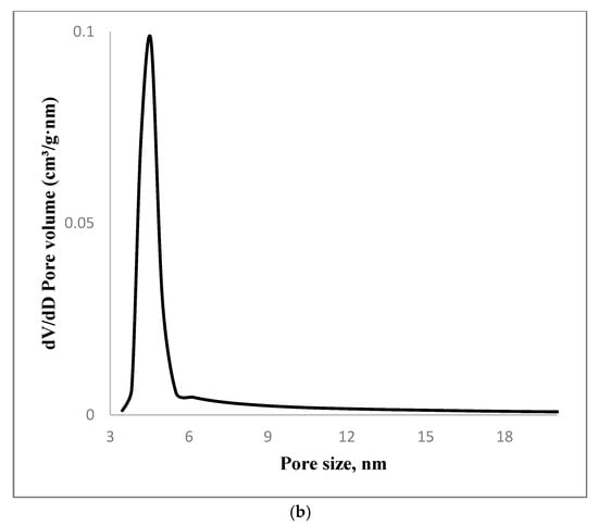 The surface morphology of the materials was investigated by scanning electron microscopy (SEM) and high-resolution transmission electron microscopy (HRTEM). Additionally, the photocatalyst’s specific surface area, pore volume, and pore diameter were measured by N2 adsorption isotherm technique at 77.3 K using BET method. Figure 4A,B presents the SEM results while Figure 4C,D indicate the results obtained by HRTEM. The findings revealed by BET are illustrated in Figure 5a,b.