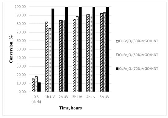 The CIP conversion with the involvement of CuFe2O4-70%/rGO/HNT after 2 h of UV is 99%, which is higher than the value reported by Tamaddon et al. [], who used the similar active phase with an initial CIP concentration of only 3 ppm. The results also showed better efficiency compared to values in previous publications [,]. This value is greater than that of samples with 30% and 50% wt. of active phase, which are at 85% and 86% correspondingly. In addition, an efficiency over 90% can be observed in all cases after 5 h of UV irradiation. This demonstrates that CuFe2O4-70%/rGO/HNT catalytic activity is superior to that of the catalysts with 30% wt. and 50% wt. of active phase. Due to the higher content of copper and iron, catalysts could react with H2O2 and water to produce more •OH radicals. The stability of the ferrite system is maintained during the decomposition process and •OH agents and then radicals are continually created with continuous conversion from Fe3+ to Fe2+ and Cu2+ to Cu+. This •OH radical could interact with CIP to create CO2 and water, following the reactions: